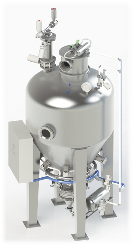 利用壓縮空氣以脈沖方式沖擊物料上升、擴散、沉降以達到在最短時間內充分混合均勻的目的。具備正壓發送的功能,混合完成的物料可正壓發送會物料暫存罐內,全程密閉輸送。